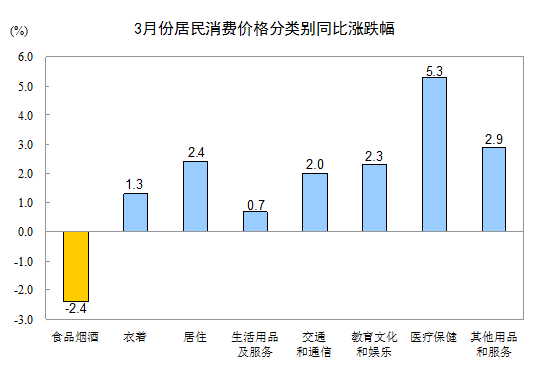 3 月份,其他七大類(lèi)價(jià)格同比均有所上漲。其中,醫療保健、其他用品和服務(wù)、居住、教育文化和娛樂(lè )、交通和通信、衣著(zhù)、生活用品及服務(wù)價(jià)格分別上漲 5.3% 、 2.9% 、 2.4% 、 2.3% 、 2.0% 、 1.3% 和 0.7% 。