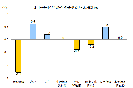 3 月份,全國居民消費價(jià)格總水平環(huán)比下降 0.3% 。其中,城市下降 0.3% ,農村下降 0.4% ;食品價(jià)格下降 1.9% ,非食品價(jià)格上漲 0.1% ;消費品價(jià)格下降 0.5% ,服務(wù)價(jià)格上漲 0.1% 。