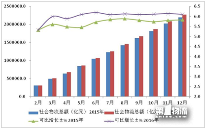 2016年,全國社會(huì )物流總額229.7萬(wàn)億元,按可比價(jià)格計算,比上年增長(cháng)6.1%,增速比上年提高0.3個(gè)百分點(diǎn)。分季度看,一季度50.7萬(wàn)億元,上半年107.0萬(wàn)億元,前三季度167.4萬(wàn)億元,比上年同期增長(cháng)6.0%,6.2%,6.1%,增速比上年同期分別提高0.4個(gè)百分點(diǎn),0.5個(gè),0.3個(gè)百分點(diǎn)??傮w來(lái)看,全年社會(huì )物流總額呈現穩中有升的發(fā)展態(tài)勢,物流需求結構持續改善。
