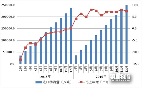 ---進(jìn)口物流需求增速逐季回穩。2016年進(jìn)口物流總額同比增長(cháng)7.1%,增速比上年提高6.9個(gè)百分點(diǎn)。從各季度情況看,一季度增長(cháng)6.3%,上半年增長(cháng)7.6%,前三季度增長(cháng)7.1%,全年增速呈現前低后高、逐季回穩的向好態(tài)勢。