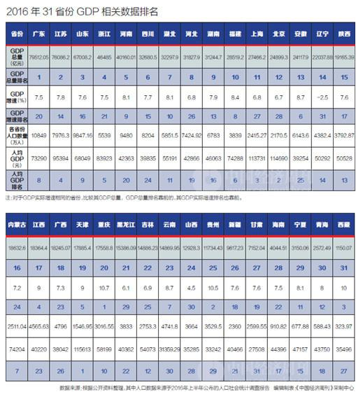 《中國經(jīng)濟周刊》記者匯總統計2016年31個(gè)省份的GDP總量、GDP增速和人均GDP三大指標,看看到底誰(shuí)的實(shí)力強?誰(shuí)的潛力大?在經(jīng)濟下行壓力加大的2016年,GDP“萬(wàn)億俱樂(lè )部”都發(fā)生了哪些變化?