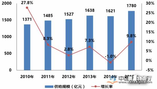 2010-2015年間中國商用冷鏈市場(chǎng)規模整體處于上升態(tài)勢,供給規模從2010年的1371億元增長(cháng)至2015年的1780億元;但是,2010-2015年期間,中國商用冷鏈供給規模增長(cháng)率波動(dòng)較大,其中2014年的供給規模下降1.0%,商用冷鏈供給規模的下降主要是由商用冷柜等相關(guān)產(chǎn)品供給規模下跌導致。