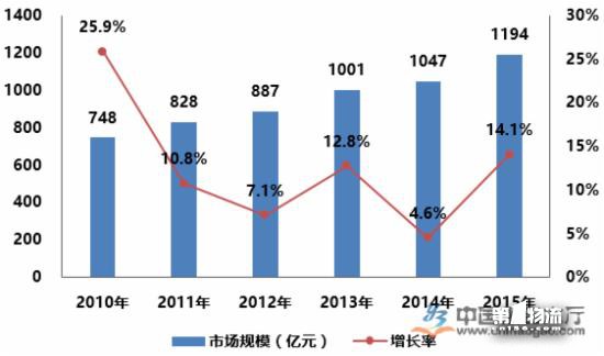 2010年,中國商用冷鏈市場(chǎng)規模為748億元,年增長(cháng)率為25.9%;2015年中國商用冷鏈市場(chǎng)規模增長(cháng)至1194億元,年增長(cháng)率為14.1%。